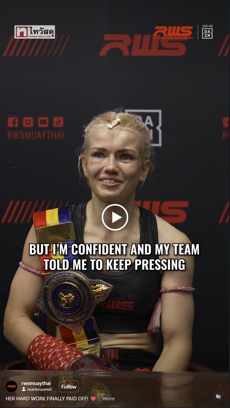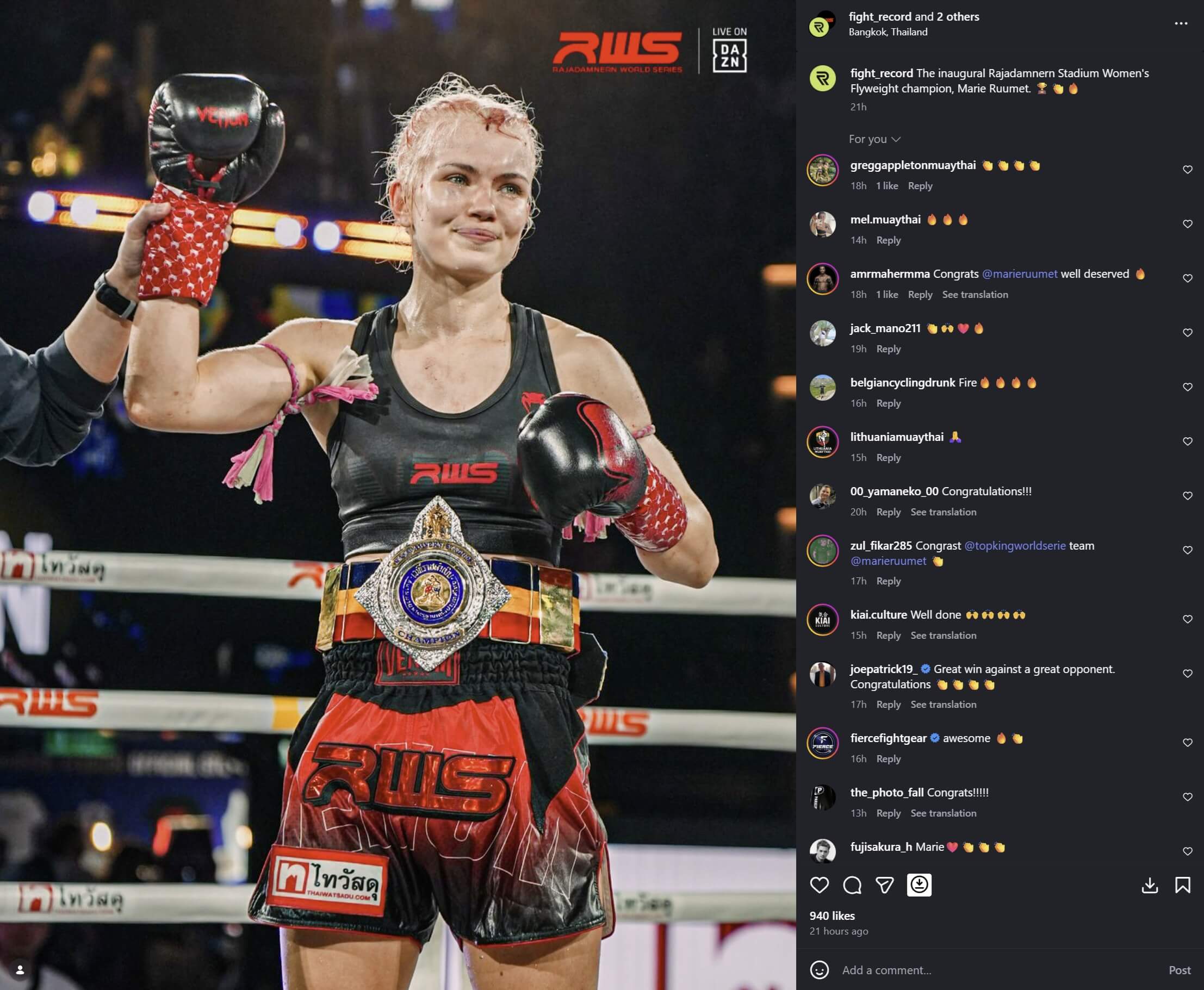 Eesti võitlussportlane Marie “Snow Leopard” Ruumet saavutas nädalavahetusel oma karjääri seni suurima võidu, tulles Bangkokis toimunud Rajadamnern World Series (RWS) turniiril naiste kärbeskaalu maailmameistriks. Peamatšis alistas Ruumet kohaliku favoriidi Zaidania Looksaikongdini.