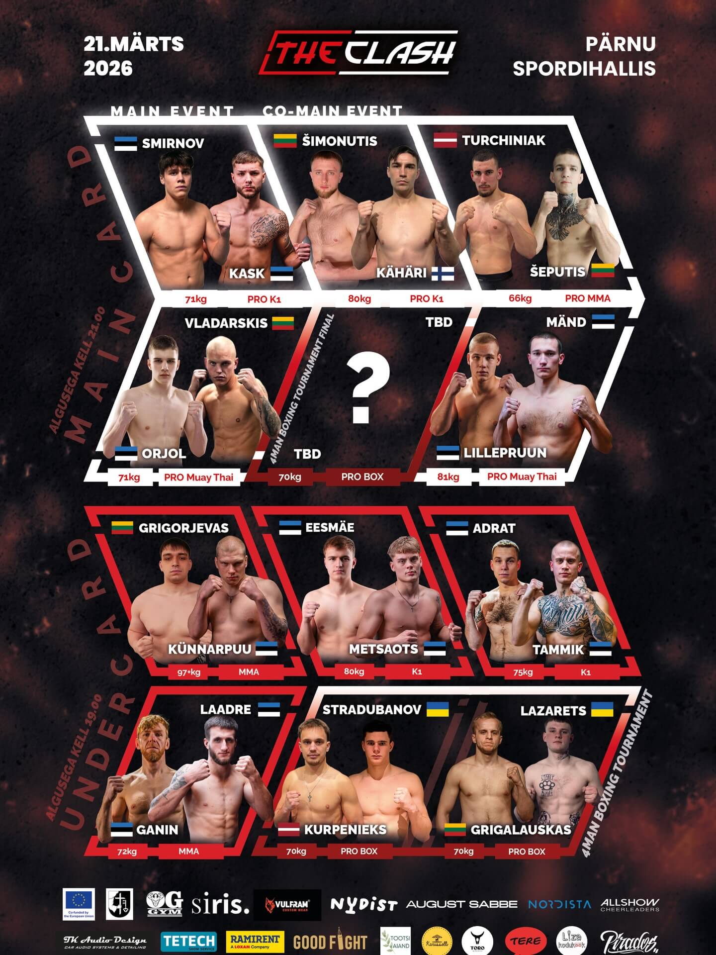 • Võitlusspordiõhtu The Clash 4 toimub 21. märtsil Pärnu Spordihallis. Juba avalikustatud võitluspaarid leiad siitRohkem infot sündmuse kohta leiad Facebookist ning piletid Fientast.