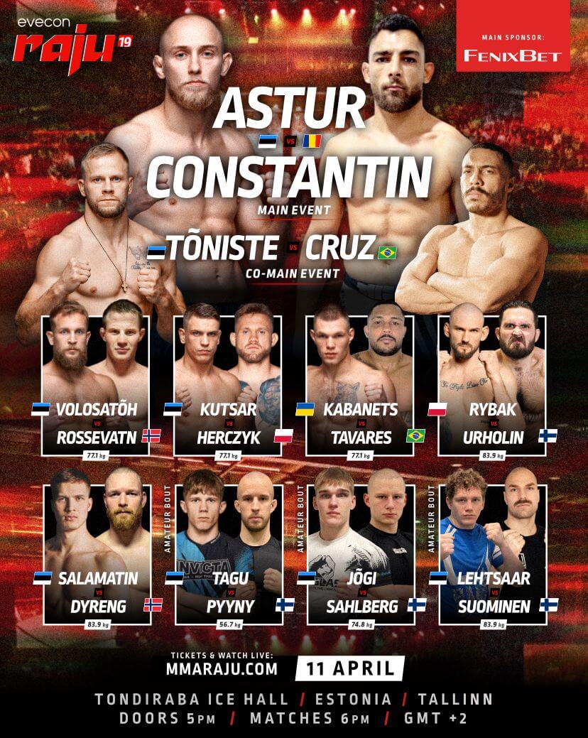 Evecon RAJU 19 peakorraldaja Ott Tõnissaar lubab tasavägiseid matše ja meeleolukat võitlusõhtut. Tema sõnul on Maikel Asturil vastas korralik, peamatši vääriline mees, kes on oma senistest võitudest peaaegu kõik enneaegselt lõpetanud ning on puuri astudes ilmselgelt näljane. Kristjan Tõniste teeb tagasitulekumatši, kus tal on soovi korral võimalik särada ka lööjana, sest vastane on sitke. Yevhenii Kabanetsi ja brasiillase Lucas Tavarese lahing saab aga olema tõeline maasikas.